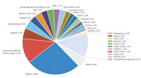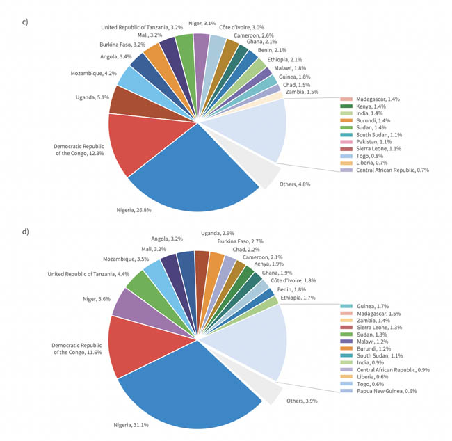 Tỷ lệ tổng số ca tử vong do sốt rét ở trẻ em dưới 5 tuổi đã giảm từ 86,8% năm 2000 xuống 76,0% vào năm 2022. Năm 2022, 29 trong số 85 quốc gia và một khu vực có bệnh sốt rét lưu hành chiếm khoảng 95% số ca sốt rét và 96% số ca tử vong do sốt rét trên toàn cầu (Hình 3.4a-b). Gần một nửa số ca nhiễm thuộc 4 quốc gia: Nigeria (26,8%), Cộng hòa Dân chủ Congo (12,3%), Uganda (5,1%) và Mozambique (4,2%) (Hình 3.3c). Ngoài ra, bốn quốc gia đã chiếm hơn một nửa số ca tử vong do sốt rét trên toàn cầu: Nigeria (31,1%), Cộng hòa Dân chủ Congo (11,6%), Niger (5,6%) và Cộng hòa Thống nhất Tanzania (4,4%) (Hình 3.3d). Nigeria chiếm 38,5% số ca tử vong do sốt rét toàn cầu ở trẻ em dưới 5 tuổi.