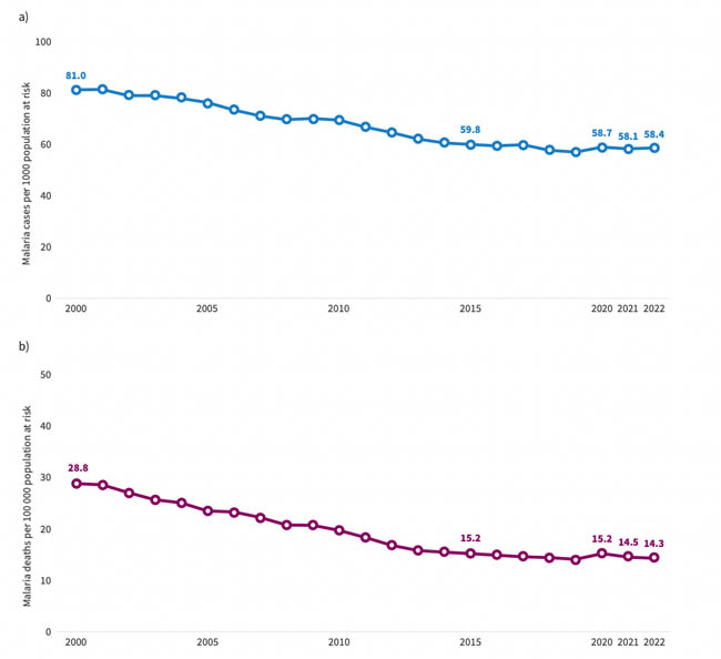Từ năm 2000 đến năm 2019, số ca tử vong do sốt rét đã giảm đều đặn, từ 864.000 năm 2000 xuống còn 576.000 vào năm 2019. Năm 2020, số ca tử vong do sốt rét đã tăng 55.000 ca lên con số ước tính là 631.000 (Bảng 3.1), một phần là do sự gián đoạn tiếp cận các dịch vụ phòng chống sốt rét và quản lý ca bệnh do đại dịch Covid-19. Tiếp theo sự gia tăng này là sự sụt giảm nhẹ vào năm 2021 và 2022, xuống lần lượt là 610.000 và 608.000. Tỷ lệ tử vong do sốt rét đã giảm một nửa từ năm 2000 đến năm 2019, từ 28,8 trên 100.000 dân có nguy cơ xuống còn 14,1 (Hình 3.3b). Năm 2020, tỷ lệ tử vong tăng lên 15,2 trên 100.000 dân có nguy cơ trước khi giảm nhẹ xuống 14,5 vào năm 2021 và 14,3 vào năm 2022.