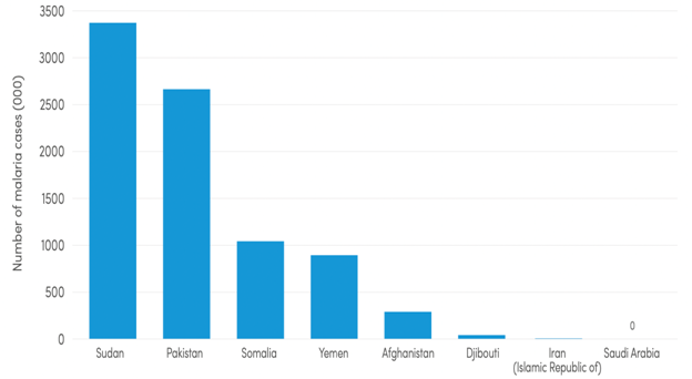 Năm 2022, Sudan chiếm phần lớn số ca sốt rét ước tính ở khu vực này (41%), tiếp theo là Pakistan, Somalia, Yemen, Afghanistan và Djibouti. Vào năm 2022, Cộng hòa Hồi giáo Iran đã báo cáo có 1.439 trường hợp được coi là nội đia, mặc dù báo cáo không có trường hợp nội địa nào trong 4 năm liên tiếp từ năm 2018 đến năm 2021. Sự gia tăng số ca bệnh ở nước láng giềng Pakistan là một yếu tố góp phần chính vào sự gia tăng số ca mắc bệnh ở nước Cộng hòa Hồi giáo Iran, đặc biệt dọc theo khu vực biên giới, nơi thường xuyên có sự di chuyển của người dân. Các yếu tố góp phần khác, bao gồm lũ quét, sự xuất hiện và lây lan của Aedes aegypti (đã làm chệch hướng một số nỗ lực và nguồn lực kiểm soát), thiếu kinh phí và khó khăn trong việc mua sắm các mặt hàng sốt rét thiết yếu do lệnh trừng phạt. Nguồn lực bị giảm dẫn đến thiếu hoặc chậm trễ trong chẩn đoán và điều trị, bên cạnh những khó khăn trong việc thực hiện điều tra và phân loại ca bệnh một cách hiệu quả. Kết quả là không thể phân biệt chính xác giữa các trường hợp nội địa và ngoại lai.