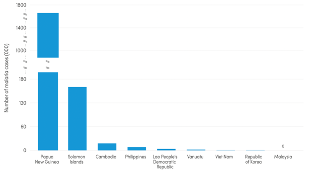 Số ca sốt rét giảm 48% tại Khu vực Tây Thái Bình Dương của WHO, từ 2,6 triệu ca năm 2000 xuống còn 1,4 triệu ca vào năm 2021. Từ năm 2021 đến năm 2022, số ca sốt rét tăng 30% lên 1,9 triệu ca (Bảng 3.5). Số ca tử vong do sốt rét cũng giảm đáng kể (56%) từ khoảng 6.300 ca tử vong vào năm 2000 xuống còn 2.600 ca tử vong vào năm 2021. Từ năm 2021 đến năm 2022, số ca tử vong tăng 37% lên 3.600. Số ca mắc và tử vong tăng trong khoảng thời gian từ năm 2021 đến năm 2022 chủ yếu là do tăng ở Papua New Guinea do thiếu hàng hóa, năng lực nguồn nhân lực và hạn chế về quản lý cũng như nguồn tài trợ trong và ngoài nước không ổn định. Từ năm 2020 đến năm 2022, số ca mắc bệnh đã gia tăng đáng kể ở Quần đảo Solomon và Vanuatu. Tỷ lệ các ca bệnh trong khu vực do P. vivax đã tăng theo thời gian, từ khoảng 17% năm 2000 lên 27% vào năm 2022, với việc phòng ngừa và điều trị sốt rét hiệu quả góp phần giảm gánh nặng P. falciparum.