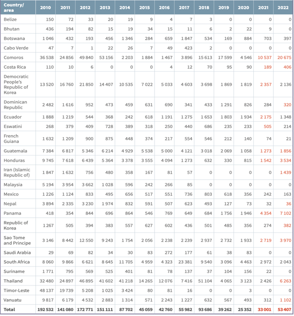 Năm thứ hai liên tiếp, Nepal tiếp tục báo cáo các trường hợp bệnh lâm sàng. Nước này vẫn điều trị bệnh nhân chỉ dựa trên các triệu chứng lâm sàng, theo quy định quốc giahướng dẫn, ngay cả khi xét nghiệm chẩn đoán âm tính. Cách tiếp cận này vẫn còn là một mối lo ngại; những sửa đổi đối với hướng dẫn quản lý hồ sơ của quốc gia có thể giải quyết được vấn đề nhưng hiện chưa được thực hiện. Ngoài ra, sự bùng phát trở lại của các ca bệnh nội địa ở Cộng hòa Hồi giáo Iran là một mối lo ngại, với 1.439 trường hợp nội địa được báo cáo vào năm 2022 sau 4 năm liên tiếp không có ca bệnh nội địa.