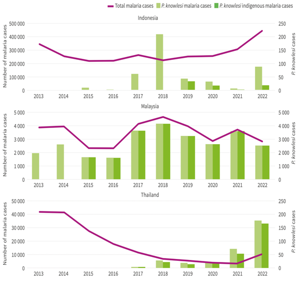 Tại Malaysia đãgiảm 30% về tổng số ca nhiễm P. knowlesi, từ 3.575 ca vào năm 2021 xuống còn 2.505 ca vào năm 2022. Hầu hết (99,9%) ca nhiễm P. knowlesi được phát hiện vào năm 2022 đều được phân loại là nội địa. Tổng số ca nhiễm P. knowlesi tăngtừ 5 trường hợp được báo cáo vào năm 2021 lên 87 trường hợp vào năm 2022 ở Indonesia và 71 trường hợp vào năm 2021 lên 176 trường hợp vào năm 2022 ở Thái Lan. Mặc dù Malaysia báo cáo số ca nhiễm P. knowlesi cao nhất, nhưng tốc độ tăng mạnh nhất ở Indonesia và Thái Lanvào năm 2022.