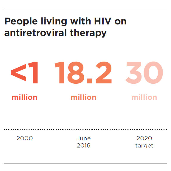 ·18,2 triệu [16,1 - 19,0 triệu] người đang sống chung với HIV được tiếp cận điều trị kháng virus (ARV) vào tháng 6/2016; tăng từ 15,8 triệu trong tháng 6 năm 2015; 7,5 triệu vào năm 2010 và ít hơn một triệu năm 2000.