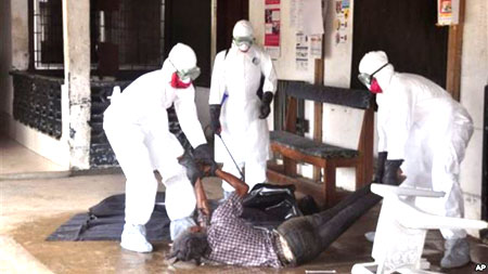 | Nhân viên y tế đang di chuyển thi thể người nghi ngờ tử vong do Ebola tại Monrovia, Liberia |