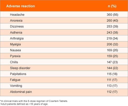 Độ an toàn và tính dung nạp của thuốc Coartem đã được nghiên cứu trên cả bệnh nhân người lớn và trẻ em. Các biến cố bất lợi và phản ứng tác dụng ngoại ý được báo cáo thường xuyên trên ≥ 10% ở các bệnh nhân người lớn (?)