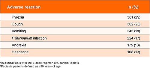 -Trong các thử nghiệm lâm sàng, tỷ lệ phải gián đoạn bệnh nhân không dùng thuốc nữa do các biến cố bất lợi khi dùng thuốc Coartem liệu trình đúng 6 liều chung là 1,1%, trong đó 0,2% (1/647) trên người lớn và 1,6% (21/1332) trên các bệnh nhi;