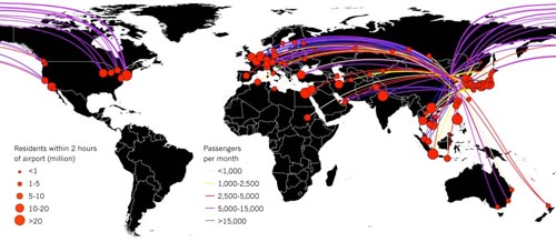 Các đường bay từ vùng dịch sẽ nhanh nhanh chóng mang virus có thể lây lan đến người ở các trung tâm đông dân cư như Châu âu, Bắc Mỹ, Châu Á. |