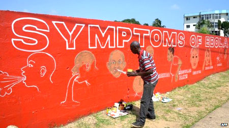 | Họa sĩ đường phố vẽ các hình ảnh trên tường cho người dân biết về các triệu chứng của Ebola ở thủ đô Monrovia của Liberia. |