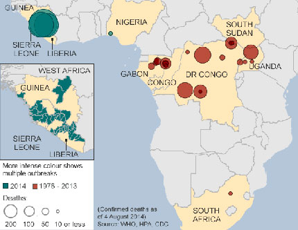 Dịch Ebola đang bùng phát khiến cho khoảng 60% số người nhiễm virus Ebola tử vong, tuần đầu tháng 8/2014 được gọi là “tuần lễ đen tối” (dark week) khi chỉ trong vòng một tuần (31/7/2014 đến 7/8/2014) ở 4 nước Tây Phi số ca chết do Ebola tăng vọt từ 729 ca lên 932 ca (Guinea (363 ca), Liberia (282 ca), Sierra Leone (286 ca), Nigeria (1 ca) và số ca mắc bệnh tăng từ 1.323 lên 1711 ca (Guinea (495 ca), Liberia (516 ca), Sierra Leone (691 ca), Nigeria (9 ca). Theo các con số mới từ Liên hiệp quốc về bệnh dịch Ebola tại Tây Phi, qua hai ngày tuần trước đã có 13 ca mới được ghi nhận tại Guinea, 77 ca tại Liberia, và 72 ca tại Sierra Leone.
