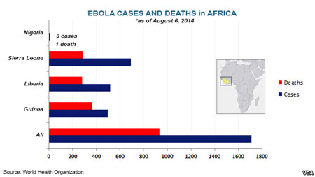 Ngày 6/8/2014. VOA News - Dịch bệnh chết chóc do Ebola cho thấy những dấu hiệu tiếp tục lây lan vào hôm thứ tư, khi Nigeria xác nhận thêm ca thứ 2 tử vong cùng với 5 ca nhiễm mới làm tăng thêm lo ngại vi-rút này sẽ lây lan xa hơn tại quốc gia đông dân nhất châu Phi này, với 174 triệu dân. Trong khi đó, Liberia đã tuyên bố tình trạng khẩn cấp vì dịch bệnh và tổng thống nước này cũng phát biểu rằng quy mô của dịch bệnh đang là một mối đe dọa đến an ninh quốc gia. Cho tới thời điểm hiện tại, các nước nhỏ và ít dân số hơn như Liberia, Sierra Leone và Guinea đã trở thành tâm điểm của dịch bệnh với con số thông báo của WHO là 932 ca chết trong số 1.711 ca mắc vào hôm thứ tư. Saudi Arabia đã báo cáo nước này đang điều tra một ca tử vong là đàn ông đã du lịch qua vùng Tây Phi.