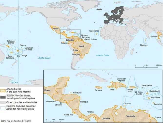 Chỉ tính riêng tại khu vực châu Mỹ đến 04/02/2016 đã có 26 quốc gia và vùng lãnh thổ thông báo có sự lây lan vi rút Zika, vào tháng 10/2015 Cape Verde-một đảo ngoài khơi Tây Phi cũng thông báo ghi nhận trường hợp nhiễm vi rút Zika. Theo thông báo của Trung tâm dự phòng và kiểm soát dịch bệnh châu Âu (eCDC) đến tháng 2/2016 đã có 36 quốc gia và cùng lãnh thổ đã ghi nhận vi rút Zika, trong đó đặc biệt đáng lưu ý là có 2 quốc gia láng giềng với Việt Nam là Trung Quốc và Thái Lanđã xác nhận các ca bệnh do virus Zika.