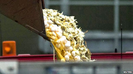 | Trứng và gà được đổ vào một công-te-nơ ở Hekendorp. |