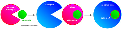 Các bằng chứng đề nghị cho thấy rằng Apicoplast là một sản phẩm của chu trình nội cộng sinh thứ phát (secondary endosymbiosis) và vì thế apicoplast có thể tương đồng và có liên quan chặt chẽ với plastid thứ phát của các trùng tảo (dinoflagellate algae). Một loại vi trùng cyanobacterium cổ xưa lần đầu tiên bị chôn vùi bởi một tế bào eukaryotic nhưng không hề quyết định. Loài vi khuẩn này đã thoát khỏi sựu phân loại, sắp đặt này vì nó hình thành nên một mối quan hệ cộng sinh với các tế bào eukaryotic vật chủ; cả eukaryote và vi khuẩn đều cùng nhau có lợi từ sự chia sẻ giả thuyết này. Kết quả của của chu trình hay mối quan hệ cộng sinh của một sinh vật sống trong cơ thể vật chủ (endosymbiosis) tiên phát là một loài tảo quang hợp (eukaryotic alga). Dọc theo vấn đề này của tảo, bản thân nó cũng bị chôn vùi bởi một heterotrophic eukaryote mà trong đó nó hình thành nên mối quan hệ cộng sinh riêng của chính mình và được xem như một plastid. Apicoplast plastid mở ra một vai trò mới để bảo tồn chỉ những chức năng như thế và cần thiết đóng góp cho lợi ích của mối quan hệ bào tử vật chủ (host-organelle relationship). Bộ gen tổ tiên hơn 150 kb đã bị làm giảm xuống do phân cắt và tái sắp xếp đến giờ này chỉ còn 35kb. Trong suốt quá trình tái sắp xếp cấu trúc của plastid thì apicoplast mất nhân của nó và đáng chú ý khả năng quang hợp. Sự mất chức năng này được đặt giả thuyết xảy ra trong giai đoạn tiến hóa sớm để cho phép đủ thời gian hoàn thành sự giáng hóa và sự biến mất của hình thái nhân.