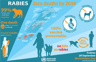 Bệnh dại là một trong những bệnh truyền nhiễm xuất hiện từ 2.300 năm trước công nguyên được coi là căn bệnh chết người nguy hiểm nhất, ngay từ năm 1885 nhà bác học Louis Pasteur đã thử nghiệm thành công vaccine phòng dại đầu tiên được nuôi cấy từ tủy sống của thỏ. Theo WHO, bệnh dại có ở hầu khắp các lục địa (trừ châu Nam Cực) với trên 55.000 người chết vì bệnh dại hàng năm, trong đó 95% các ca tử vong xảy ra ở Châu Á và Châu Phi. Về các loài động vật lây truyền bệnh dại cho người thì chó được xem là động vật chủ yếu gây bệnh dại trên thế giới nhưng ở châu Mỹ thì dơi là nguồn lây bệnh chủ yếu, đặc biệt là những năm gần đây dơi cũng là loài động vật lây bệnh dại cho người ở châu Đại dương (Australia) và châu Âu. Các động vật hoang dã như chồn, cáo, sóc, chó rừng, mèo rừng hiếm khi lây bệnh dại cho người. Bệnh dại lây truyền khi tiếp xúc với nước bọt, vết thương của người bệnh dại hoặc qua vết cắn của động vật có chưa virus dại. Ngày thế giới phòng chống bệnh dại (World Rabies Day_WRD) là một chiến dịch quốc tế phối hợp của liên minh toàn cầu về kiểm soát bệnh dại (GARC)-một tổ chức phi chính phủ có trụ sở chính tại Hoa Kỳ (USA) và Vương Quốc Anh (UK) là tổ chức có xác nhận quốc tế của các tổ chức sức khỏe con người và thú y như WHO, OIE, các trung tâm kiểm soát và phòng ngừa dịch bệnh…Ngày thế giới phòng chống bệnh bại liệt diễn ra vào ngày 28/9 hàng năm nhằm kỷ niệm ngày mất của nhà bác học Louis Pasteur, người đã cùng các đồng nghiệp thử nghiệm thành công loại vắc xine phòng dại đầu tiên được nuôi cấy từ tủy sống của thỏ. WRD cũng nhằm mục đích nâng cao nhận thức toàn cầu về tác động của bệnh dại trên người và động vật, tăng cường giáo dục cồng đồng địa phương phòng chống bệnh dại, cung cấp thông tin và lời khuyên về cách để ngăn chặn căn bệnh này và làm thế nào các cá nhân và tổ chức có thể giúp loại bỏ các nguồn chính toàn cầu, huy động và tổng hợp tất cả các nguồn lực để phòng dại cho người và kiểm soát dịch bệnh trên động vật.