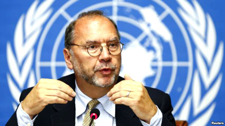 | Nhà nghiên cứu virus Ebola Peter Piot phát biểu trong một cuộc họp báo tại Liên Hiệp Quốc sau một cuộc họp tham vấn tại WHO tại Geneva, ngày 7/10/2014 |