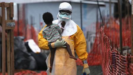 Vào tháng 10/2014, một nhân viên y tế của tổ chức Bác sĩ Không Biên giới (MSF) bế một đứa trẻ nghi ngờ nhiễm Ebola tại Liberia. Vì nội chiến và nạn đói cao độ, không có đủ bác sĩ: Liberia có 0,014 bác sĩ trên 1.000 người, Sierra Leone có 0,022 và Guinea có 0,1. Ngược lại, Hoa Kỳ có 2,5 bác sĩ trên 1.000 người.