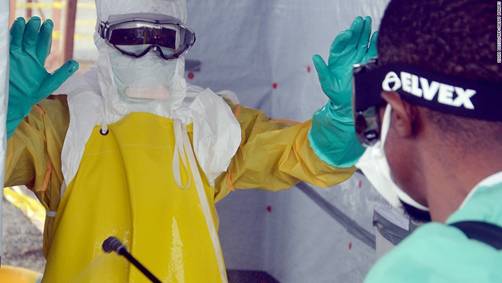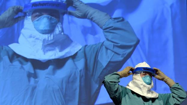 Bức hình từ hồi tháng 8/2014 này cho thấy một y tá đang khử trùng cho bộ đồ bảo hộ của một bác sĩ tại bệnh viện Ebola tại Monrovia, Liberia Các hệ thống y tế công cộng yếu ớt ở trung tâm của dịch bệnh tại Liberia, Sierra Leone và Guinea đã trở thành những nơi cấp cứu tập trung đầu tiên của Ebola. Chúng đổ sụp vì hàng trăm nhân viên y tế với trang thiết bị bảo hộ thiếu thốn bị mắc bệnh. Tính đến ngày 29/3/2015 đã có 861 ca và 495 ca tử vong trong số những nhân viên y tế ở ba nước Tây Phi.
