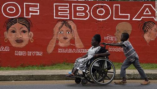 Một cậu bé ở Monrovia đẩy chiếc xe lăn chở người phụ nữ qua một bức tường có thông tin về Ebola vào tháng 9/2014, một số ngôi làng đã mất đi toàn bộ nhóm dân ở độ tuổi lao động, khiến cho không biết bao nhiêu trẻ em rơi vào cảnh mồ côi. Một tổ chức phi lợi nhuận hoạt động liên quan đến với những trẻ em mồ côi tin rằng hơn 12.000 trẻ em đã mất đi người chăm sóc chính của mình. Các trường học bị đóng cửa trong gần một năm và chỉ mới mở lại gần đây.