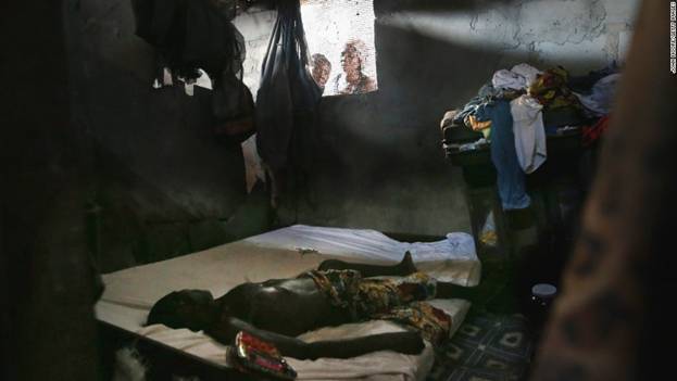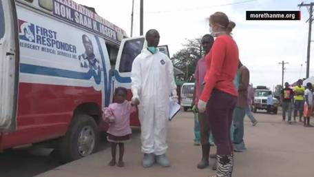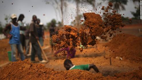 Các nhân viên y tế từ Đội chôn cất Hội Chữ thập đỏ của Sierra Leone khiêng một xác chết ra khỏi một ngôi nhà. "Chúng tôi nhận được phản hồi rất tích cực từ các cộng đồng," James nói. " Trong nhóm chôn cất của chúng tôi không có ai bị nhiễm bệnh cả,, điều đó thực sự cho thấy các tiêu chuẩn của quy trình thực hiện của chúng tôi và mức độ nghiêm ngặt mà các đội đã làm theo các nguyên tắc mặc và cởi đồ bảo hộ như thế nào. Quan trọng nhất, các đội đều tuân theo việc thực hành không đụng chạm và tránh những nơi đông đúc. Chúng tôi liên tục đào tạo các đội chôn cất của chúng tôi để họ duy trì cảnh giác. Dù số các ca mắc đang giảm bớt nhưng chúng ta không thể trở nên tự mãn.”