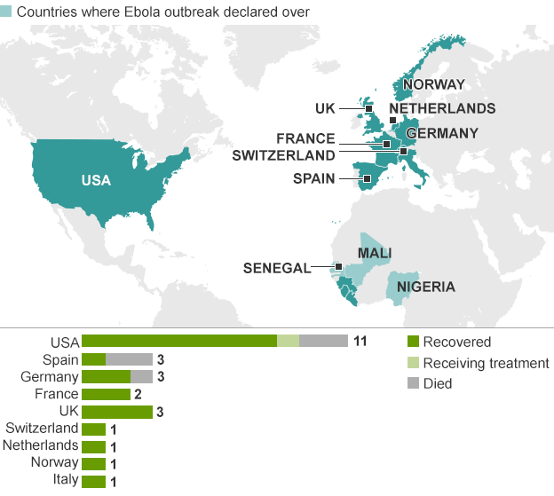 Trường hợp đầu tiên nhiễm virus chết người này tại Mỹ được công bố vào ngày 1/10/2014. Thomas Eric duncan, 42 tuổi, bị nhiễm virus tại Liberia trước khi đến Mỹ, đã tử vong vào ngày 8/10/2015. Ông không có biểu hiện các triệu chứng bệnh cho đến ngày 24/9/2014, 5 ngày sau khi ông đến, những người có tiếp xúc với ông đã được theo dõi các triệu chứng của bệnh. Hai nhân viên y tế tại Dallas, Texas đã điều trị cho Duncan xét nghiệm dương tính với Ebola khi ông tử vong nhưng cả hai đã được hồi phục. Ca tử vong thứ hai tại Mỹ là bác sĩ Martin Salia, từ Sierra Leone. Ông được đưa lại Mỹ vào tháng 11/2014 và điều trị Ebola tại bệnh viện ở Nebraska nhưng bác sĩ Salia dã tử vong trong một thời gian ngắn sau đó. Y tá Teresa Romero, Tây Ban Nha là người đầu tiên nhiễm virus bên ngoài Tây Phi. Cô là một thành viên của nhóm khoảng 30 nhân viên tại bệnh viện Carlos II ở Madrid đã chăm sóc cho 2 bệnh nhân là nhà truyền giáo, họ đã trở về từ Liberia và Sierra Leone sau khi bị nhiễm virus. Đức, Na Uy, Pháp, Ý, Thụy Sĩ và Anh đã điều trị tất cả bệnh nhân bị nhiễm virus tại Tây Phi.
