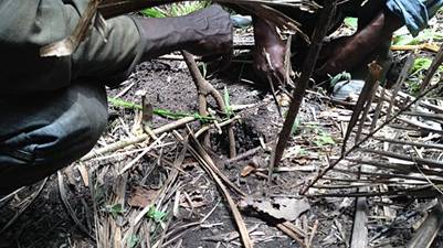 Tất cả những cái bẫy là những sự sắp xếp phức tạp các cành cây gỗ đàn hồi và một cuộn dây thòng lọng sẽ thắt vào chân hoặc cổ động vật. Một chiếc bẫy là một lối vào hấp dẫn bằng tre được thiết kế để nhử một con thú không may vào. Một người thợ săn bò qua lối vào nhỏ này để biểu diễn cho tôi thấy quy trình hoạt động của bẫy. Anh ta giả làm con thú bị sập vào sợi dây đã đợi sẵn. Người thợ săn sau đó nằm sõng soài trên mặt đất, la hét giống như một con thú sẽ làm khi nó cố gắng trốn thoát vô ích. Tôi nghĩ rằng đó là một màn trình diễn man rợ. Nhưng tất cả chúng tôi đều phải cười ầm ĩ lên khi người đàn ông giả thú đột ngột “chết” và rơi phịch xuống vào bụi cây thấp. Những người thợ săn cho biết họ chỉ cho tôi thấy cái bẫy như là một “màn trình diễn” nhưng tôi đã nhận ra rằng đây không phải là tất cả trong số những màn trình diễn trung thực/giả dối khôi hài của người Sierra Leone. Điều khá rõ ràng với tôi đó là con đường rừng chúng tôi đã đi dọc theo để đi tới chỗ những cái bẫy là một con đường có nhiều người qua lại. Rõ ràng những người thợ săn thường xuyên ở đây. Đã có những gốc cây mới bị cắt và những người đàn ông đi cùng tôi cẩn thận gài lại những chiếc bẫy “trình diễn” khi chúng tôi rời đi. Rõ ràng họ không thấy phí một chuyến đi tới khu vực bẫy dù rằng đó là một chuyến đi cùng với một nhà báo.