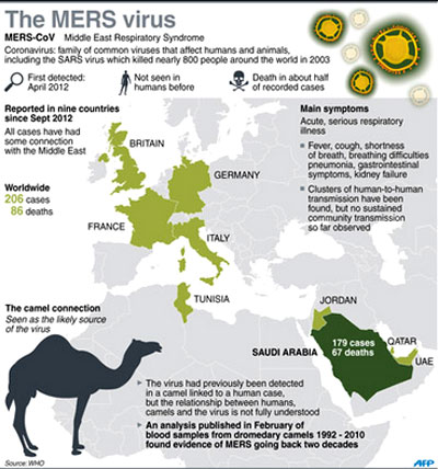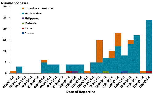Trong thời gian từ 13/4/2014 đến 23/4/2014, có 108 trường hợp mắc bệnh đã được báo cáo từ Bộ Y tế của các nước cụ thể như Ả Rập Saudi có 83 trường hợp, Cộng hòa Emirates (UAE) có 23 trường hợp, Malaysia có 1 trường hợp và 01 ca từ Hy Lạp.