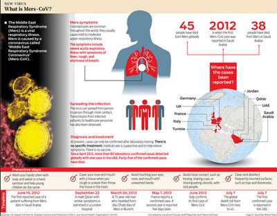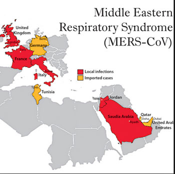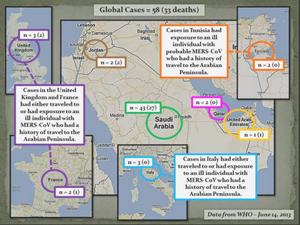 Số ca nhiễm MERS-CoV ở người được báo cáo từ bản đảo Ả rập đã gia tăng nhanh trong những tuần qua. Đặc biệt, có 2 nhân viên y tế liên quan đến một chùm ca bệnh ở Jeddah và Abu Dhabi đã được báo cáo với số lượng lớn các ca bệnh. Các ca nhiễm MERS-CoV được báo cáo từ Philippines, Malaysia và Hy Lạp trong tuần qua có thể liên quan đến những nhân viên y tế này liên quan đến chùm ca bệnh.