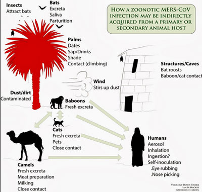 Bằng chứng đầu tiên cho thấy, lạc đà một bướu là một phần của chuỗi lan truyền bệnh và đã được phát hiện tỷ lệ các kháng thể cao chống lại MERS-CoV ở các con lạc đà một bướu trên bán đảo Ả Rập. Có bằng chứng nhiễm MERS-CoV ở những con lạc đà trước khi có bằng chứng đầu tiên về nhiễm bệnh ở người.