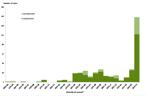 | Hình 1. Sự phân bố các ca nhiễm MERS-CoV đã được xác định theo tháng khởi phát và tình trạng lâm sàng trong giai đoạn từ 3/2012 đến 23/4/2014 (n=345*) |