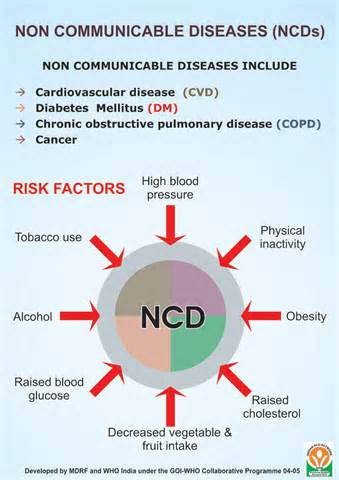 Theo những con số minh chứng của WHO,hút thuốc lá (kể cảphơi nhiễm với hút thuốc thụ động) làm 7,2 triệu người chết mỗi năm và dự báosẽ tiếp tục tăng đáng kể trong những năm tới; chế độ ăn uống không lành mạnh làm 4,1 triệu người chết hàng năm do tiếp thụ lượng muối ănquá cao; hơn một nửa trong số 3.3 triệu ca tử vong NCDs hàng năm là do uống rượukể cả ung thư và 1,6 triệu người chết mỗi năm do hoạt động thể chất không đầy đủ.Các yếu tố nguy cơ chuyển hóa (metabolic risk factors) góp phần vào 4 thay đổi vềchuyển hóaquan trọng làm tăng nguy cơ mắcNCDs như tăng huyết áp (raised blood pressure); thừa cân, béo phì (overweight, obesity);tăng đường huyết (hyperglycemia) haynồng độ đường huyết cao(high blood glucose levels); tăng lipide huyết (hyperlipidemia) hay nồng độc hất béo cao trong máu (high levels of fat in the blood). Trong đó, yếu tố nguy cơ chuyển hóa hàng đầu thế giới là huyết áp cao chiếm 19% tử vong toàn cầu, tiếptheo là thừa cân, béo phì và tăng đường huyết được coi là các yếu tố nguy cơ chuyển hóa có thể dẫn đến bệnh tim mạch,nguyên nhânhàng đầu về tử vong sớm.