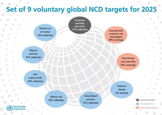 Hỗ trợ các nước trong nỗ lực quốc gia, “Kế hoạchhành độngtoàn cầu về phòng ngừa và kiểm soát NCDs”2013-2020 của WHO bao gồm 9 mục tiêu toàn cầu có ảnh hưởng lớn nhất đến tỷ lệ tử vong NCDs đề cập đến dự phòng và quản lý NCDs như sau:
