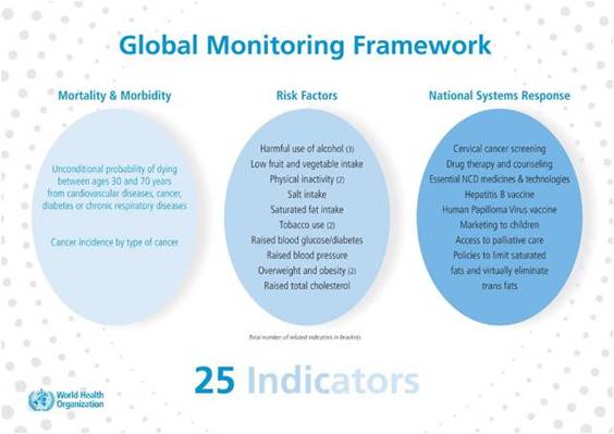 Khung giám sát toàn cầu về NCDs của WHObao gồm 25 chỉ số theo dõi thực hiện các chiến dịch hành động thông qua giám sát và và báo cáo về các mục tiêu toàn cầu vào năm 2015 và 2020. Kế hoạch hành động không giới hạn trong phạm vi khuôn khổ giám sát toàn cầu dự kiến sẽ tạo ra tiến bộ trong dự phòng và kiểm soát NCDs cung cấp nền tảng cho tuyên truyền, nâng cao nhận thức, tăng cường cam kết chính trị và thúc đẩy hành động toàn cầu để giải quyết những căn bệnh chết người. Khuôn khổ này cũng sẽ giúp hình thành một chương trình nghị mới, phát triển tiến bộ về 3 khía cạnh của SDGs bao gồm phát triển kinh tế, phát triển bền vững môi trường và hòa nhập xã hội.