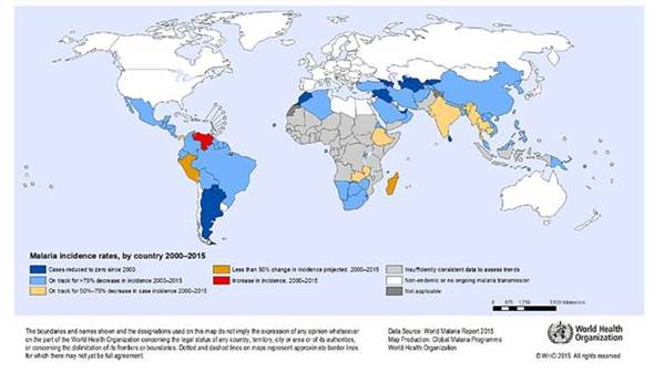Khác với báo cáo sốt rét phát hành hồi đầu năm (WHO 2016, Factsheet on the World Malaria Report 2015. Geneva, Switzerland (WPRO), trong năm 2015 thế giới có 97 quốc gia và vùng lãnh thổ nằm trong vùng sốt rét lưu hànhvới 214 triệu ca mắc sốt rét và 438.000 trường hợp tử vong sốt rét; Báo cáo sốt rét mới của WHO(World Malaria Report 2016) dựa trên dữ liệu từ 91 quốc gia và khu vực có sự lây truyền bệnh sốt rét đang diễn ra, trong năm 2015 thế giới có 212 triệu ca sốt rét mới (khoảng 148-304 triệu), trong đó khu vực châu Phi của WHO chiếm 90% số ca mắc sốt rét toàn cầu, tiếp đến là Đông Nam Á (7%) và Đông Địa Trung Hải (2%).