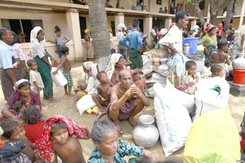 Những người di tản quốc tế Rohingya (IDP) chờ đợi một chiếc xe để trở về trại của họ sau khi chờ cơn bão Mahasen biến mất trong một nhà thờ Hồi giáo bên ngoài Sittwe. |