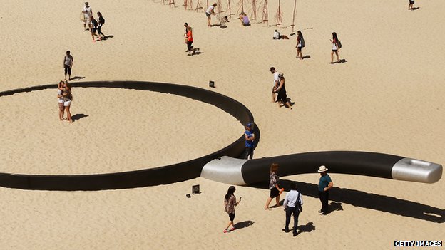 Một tác phẩm có tên “Chúng ta đang bị rán tại đây” trên một bãi biển ở Sydney