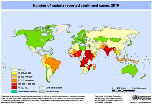 Bản đồ phân bố sốt rét của WHO năm 2010, sốt rét vẫn tập trung chủ yếu ở châu Phi và Ấn Độ