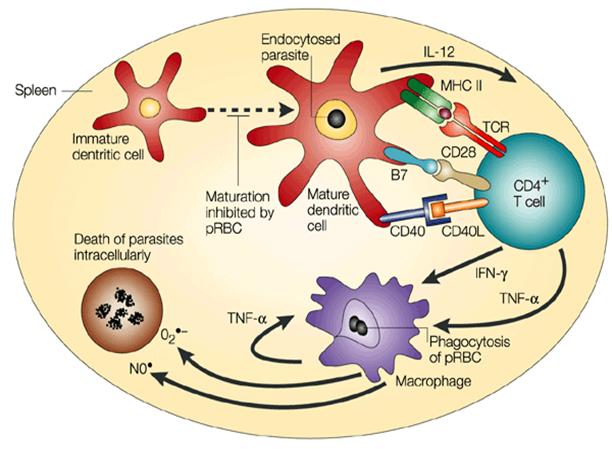 Quá trình kích hoạt các tế bào T CD4+ bởi các tế bào tua gai trưởng thành dẫn đến hoạt hóa đại thực bào, quá trình thực bào của các hồng cầu nhiễm KSTSR (PRBC) và quá trình tiết ra cytokine, các phân tử tiền viêm (oxit nitric, oxy).
