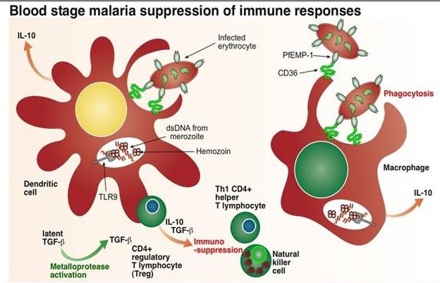 Interleukin 10 (IL-10) và yếu tố biến đổi tăng trưởng (TGF-β) ức chế quá trình hoạt hóa tế bào TH1 và quá trình tiết INF-γ. Các HC biểu hiện protein bề mặt PfEMP-1 bắt cặp với marker CD36 trên đại thực bào và tế bào tua, khởi động chuyển hóa IL12 thành IL-10. Bên cạnh đó, sắc tố (sản phẩm của quá trình chuyển hóa haemoglobin) tăng cường sự bắt cặp dsDNA của KST và thụ thể TLR9, dẫn đến hoạt hóa Tregs (CD4+ regulatory T lymphocyte) tạo nên các yếu tố ức chế miễn dịchlà TGF- β và IL-10 (đây là các yếu tố có khả năng ngăn chặn các tổn thương bởi nguyên nhân kích thích miễn dịch quá mức). TGF-β thường tồn tại ở dạng tiềm ẩn (hoạt hóa bằng quá trình phân giải protein do enzyme protease như thrombospondin hoặc calpain.