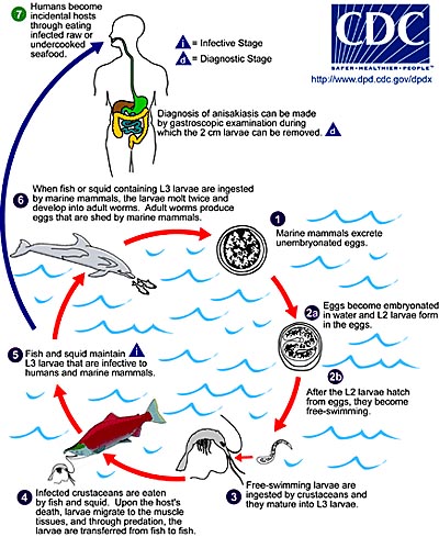 6.Center for Food Safety & Applied Nutrition, 2003. "Anisakis simplex and related worms" (On-line). Bad Bug Book. http://vm.cfsan.fda.gov/~mow/chap25.html.