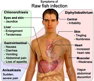 Các triệu chứng khác nhau của loài ký sinh trùng này do ăn cá sống: Clonorchis sinensis (một loại sán lá gan nhỏ), Anisakis (một loại giun tròn) và Diphyllobothrium (một loại sán dải cá), tất cả gây bệnh lý ở dạ dày ruột, nhưng triệu chứng lại biểu hiện khác nhau.