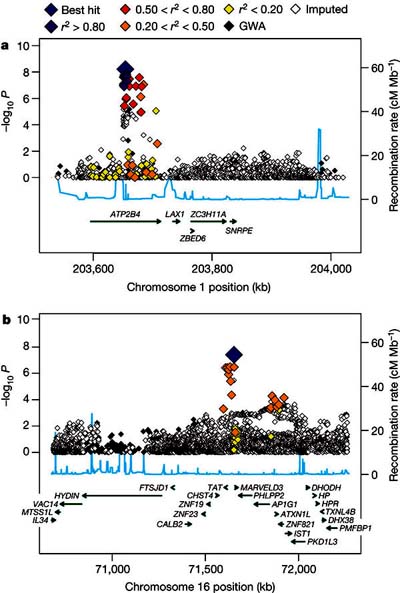 a, b, ATP2B4 locus (a) and MARVELD3locus (b) as defined by the positions of SNPs showing a linkage disequilibrium of r2= 0.05 with the lead SNP rs10900585 (a; P= 6.1 × 10−9) and SNP rs2334880 (b; P = 3.9 × 10−8), respectively. Disease ass… (nguồn: Nature) |