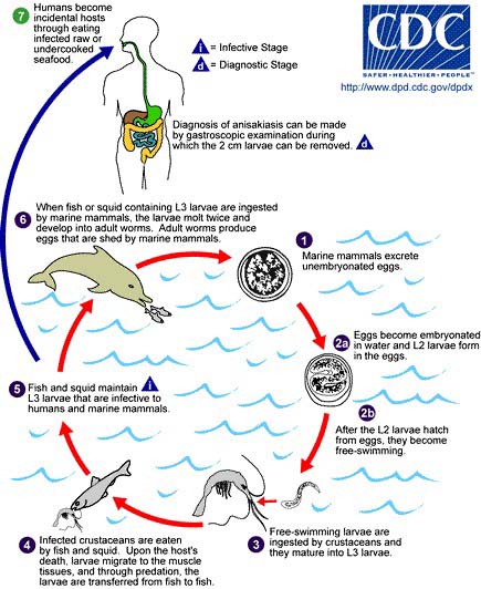 Hải cẩu, cá heo, và một số động vật biển lớn khác đóng vai trò như một nhóm vật chủ của ký sinh trùng như bệnh giun anisakids. Trứng của ký sinh trùng thải qua phân của động vật biển thải ra trong nước, chúng đẻ trứng thành ấu trùng, cá ăn lại ấu trùng (các loại cá nhưcod, salmon hoặc herring). Khi những con cá này bị nhiễm đến miệng của chúng ta mà chưa được nấu chín hoặc sống vấn đề xảy ra là chắc chắn. May thay, các triệu chứng của bệnh Anisakiasis đe dọa mạng sống. Ấu trùng đào hầm trong niêm mạc dạ dày, ruột, dẫn đến loét, làm đau chúng ta, đôi khi nôn hoặc buồn nôn, một số ca có triệu chứng cảm giác ngứa ngáy thành sau họng.