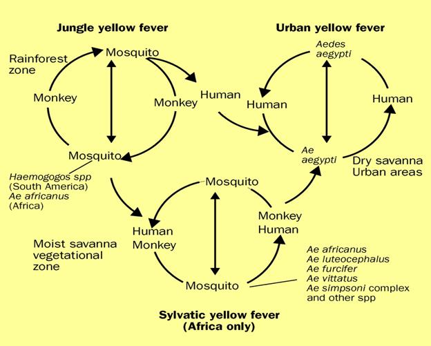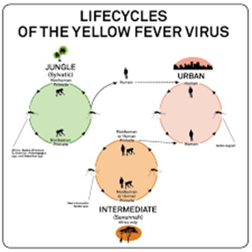 ·Sốt vàng có chu kỳ lan truyền thuộc rừng núi (Sylvatic or jungle): Tại các vùng rừng mưa nhiệt đới, các con khỉ là ở chứa đầu tiên của bệnh sốt vàng do các loài muỗi hoang dại đốt đầy virus vào trong máu của các con khỉ khác. Thỉnh thoảng, con người đang làm việ hoặc đang đi du lịch vào các vùng rừng dễ bị đốt bởi các muỗi nhiễm bệnh và phát bệnh sốt vàng;