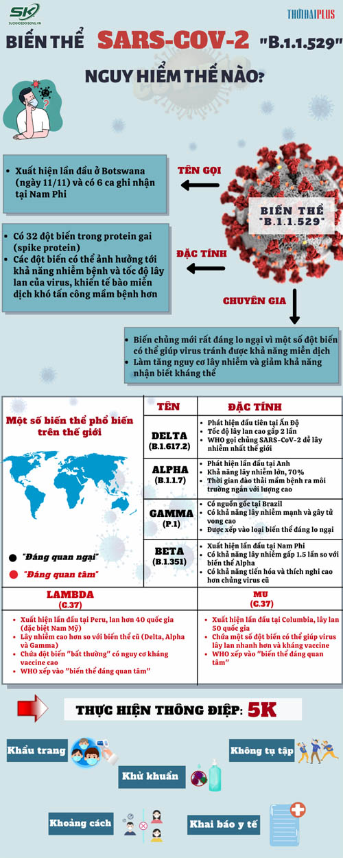 Ngày 26/11, Tổ chức Y tế Thế giới (WHO) đặt tên cho biến thể B.1.1.529 là Omicron.Omicron là biến thể mới của virus SARS-CoV-2 gây đại dịch COVID-19. WHO xếp Omicron vào nhóm biến thể "đáng lo ngại" cần nghiên cứu về mức độ gia tăng lây nhiễm hoặc kháng vaccine, tránh né miễn dịch.Omicron có khoảng 50 đột biến, trong đó có 32 đột biến trên protein gai (spike protein), gấp đôi số đột biến ở Delta -loại biến thể đang chiếm đa sô trên toàn cầu hiện nay.