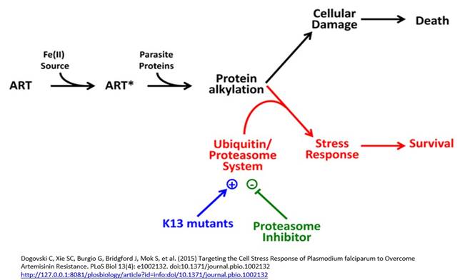 Các nhà khoa học tin rằng artemisinins được kích hoạt sang trạng thái độc thông qua tương tác với phần haemoglobin có chứa sắt khi KSTSR tiêu hóa Hb. Giả thuyết này đã được chứng minh bởi nghiên cứu trước đây của bà Tilley phát hiện thấy việc tiêu hóa Hb cần thiết cho việc kích hoạt artemisinins. Nghiên cứu bằng kính hiển vi cũng cho thấy hệ tiêu hóa của KSTSR chưa phát triển khi chúng chưa trưởng thành. Điều này cho thấy KSTSR chưa trưởng thành sẽ không tiêu hóa Hb và như vậy được bảo vệ khỏi độc tố của artemisinins. Tuy nhiên, cho đến nay, hiện tượng này chưa được để ý tới trong thử nghiệm về nguy cơ kháng thuốc, trong đó KSTSR được tiếp xúc với thuốc trong cả quá trình phát triển, đủ thời gian để thuốc có tác động lên chúng.