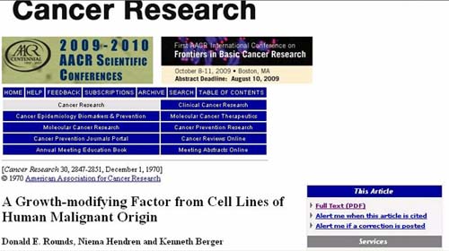 Từ năm 1970, nhà sinh học Donald E. Rounds nhận thấy trong môi trường cây tế bào ung thư có một chất tiết ra, ông cố tìm xem nó là gì. Công trình này được công bố trong tạp chí nghiên cứu ung thư số 30, năm 1970 (Cancer Research 30, pp.2847 - 2851, Dec.1970). Vì vậy, các công trình tiếp theo đến nay đã 39 năm vẫn lấy mã số DR-70.