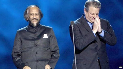 | Những người nhận giải Nobel Hòa Bình vào năm 2007: Rajendra Pachauri thay mặt IPCC (trái) và cựu Phó Tổng Thống Hoa Kỳ Al Gore (phải) |