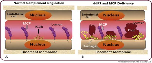 Một số trường hợp hiếm hơn của hội chứng HUS (khoảng 10% số ca) không óc triệu chứng đi trước như STEC và được nghĩ đến do thiếu hụt yếu tố H (một protein điều hòa bổ thể) mà gây ra các sự hoạt hóa các thành phần bổ thể không thể kiểm soát được sau khi tổn thương lớp nội mô nhỏ hình thành nên các cục máu đông.