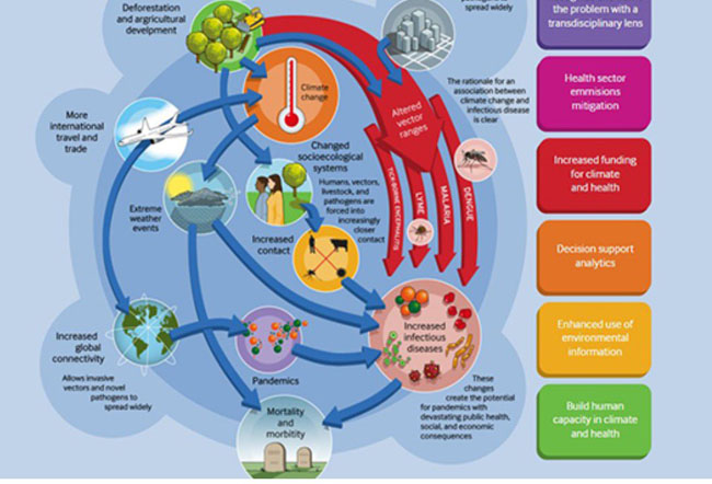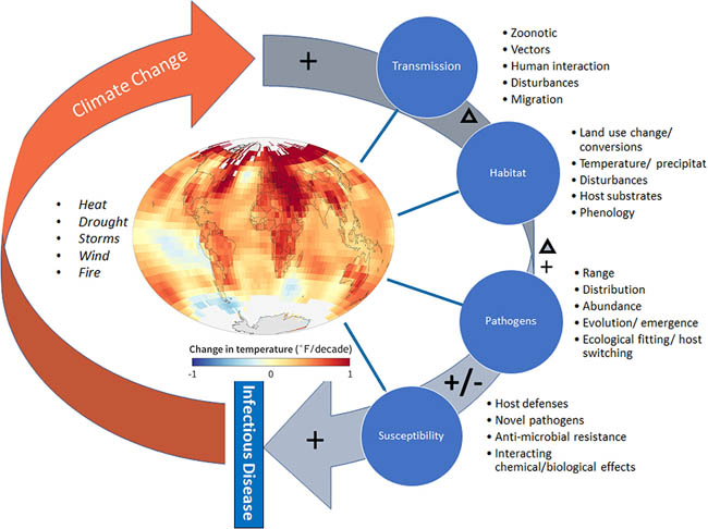 Các dịch bệnh truyền nhiễm giờ đây có liên quan trực tiếp đến sự ấm lên của toàn cầu, với với nguy cơ lan rộng đằng sau vùng nhiệt đới đến các vùng ôn đới. Do sự bất biến của thời tiết, khí hậu, sự ấm lên của toàn cầu đang tạo ra các dữ kiện như lũ lụt, hạn hán, lốcxoáy, bão xảy ra thường xuyên hơn. Đầu năm 2023, TCYTTG cảnh báo hai bệnh Dengue và Chikungunya đang tăng và lan rộng à ảnh hưởng đến 50% dân số thế giới. Các thay đổi trên hành tinh này xảy ra quá nhanh đến nổi con người và động vật không thể thích nghi kịp trước sự biến đổi của các tác nhân virus, vi khuẩn và ký sinh trùng có thể dễ dàng lan rộng hơn.