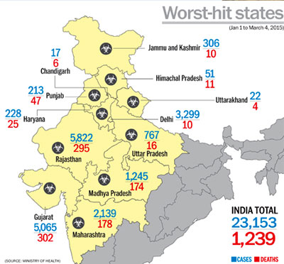 Những bứt phá bất ngờ của các trường hợp tử vong bắt đầu từ cuối tháng 12/2014 và đầu tháng 1/2015 cả ở miền Trung và nhiều bang của Ấn Độ. Tiến sĩ Aditya Aaterya, phụ trách Chương trình Rajasthan của Integrated Disease Surveillance (IDSP), đơn vị cấp nhà nước chịu trách nhiệm giám sát dịch cho biết: "Các bứt phá của dịch bệnh là bất ngờ, tình hình trở nên phức tạp bởi một mùa đông kéo dài thuận lợi cho virus, trong đó mùa lễ hội vào tháng mười hai-tháng Giêng tụ họp quần chúng trong các hình thức tổ chức đám cưới, vì vậy dịch bệnh có thể lây truyền dễ dàng. Mặc dù người ta không thể gán nó vào một yếu tố, thời tiết chỉ đóng góp một phần".